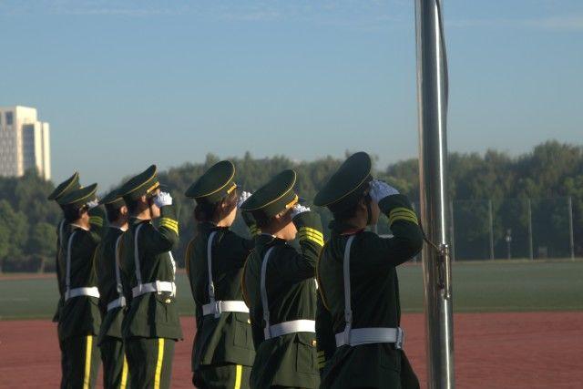 天高云淡,金桂飘香,迎着朝阳,国旗护卫队护旗手入场,他们口号响亮、军步整齐,正步走来。随后,伴随着《义勇军进行曲》的激扬旋律,升国旗、奏国歌,全体师生行注目礼,庄严肃立,此时此刻,每个人脸上洋溢着微笑,心中都涌动着浓浓的自豪感。仰望蓝天,五星红旗迎风飘扬,冉冉升起的五星红旗激发了同学们不断向上的斗志,点燃了同学们的爱国热情。