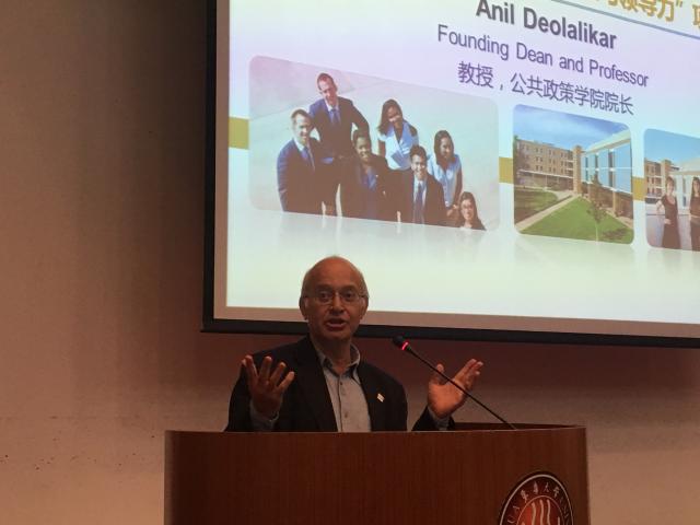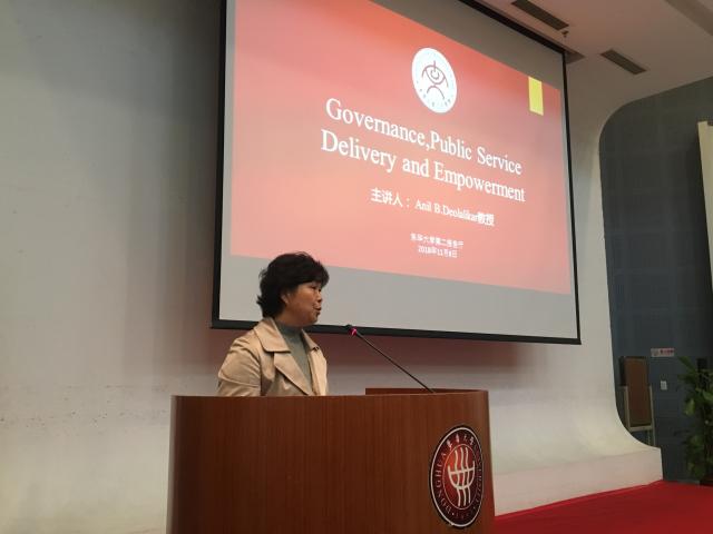 2018年11月8日下午,美国加州大学河滨分校公共政策学院院长Anil B. Deolalikar访问sjb世俱杯中国官网入口,并在图文信息第二报告厅,为sjb世俱杯中国官网入口师生作了题为《亚洲发展中国家的授权与公共服务提供》的学术报告,sjb世俱杯中国官网入口党委书记王英出席本次活动并致欢迎辞,sjb世俱杯中国官网入口王锐兰教授,副教授刘奕、尹艳华、邓志锋一同出席本次活动。