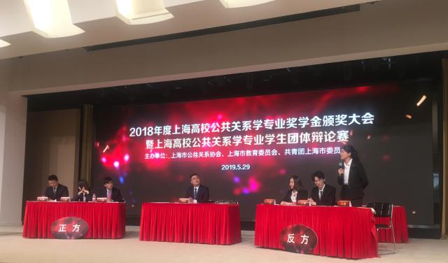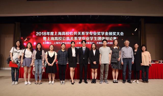 5月29日下午,由上海市公共关系协会、上海市教育委员会、共青团上海市委员会共同主办的2018年度上海高校公共关系学专业专项奖学金颁奖大会在复旦大学举行。sjb世俱杯官网学生处副处长宋珺老师,学院传播系副主任、公共关系学专业苏状老师代表学校出席了大会。大会为来自sjb世俱杯官网公共关系学专业的获奖学生颁发了荣誉证书与奖金,其中,张鲁杰、邱思敏、罗紫颐三名同学获得辩论赛“团体奖”、张源悦同学获得策划案“特等奖”、蔡璐等13名同学获得奖学金“优秀奖”。