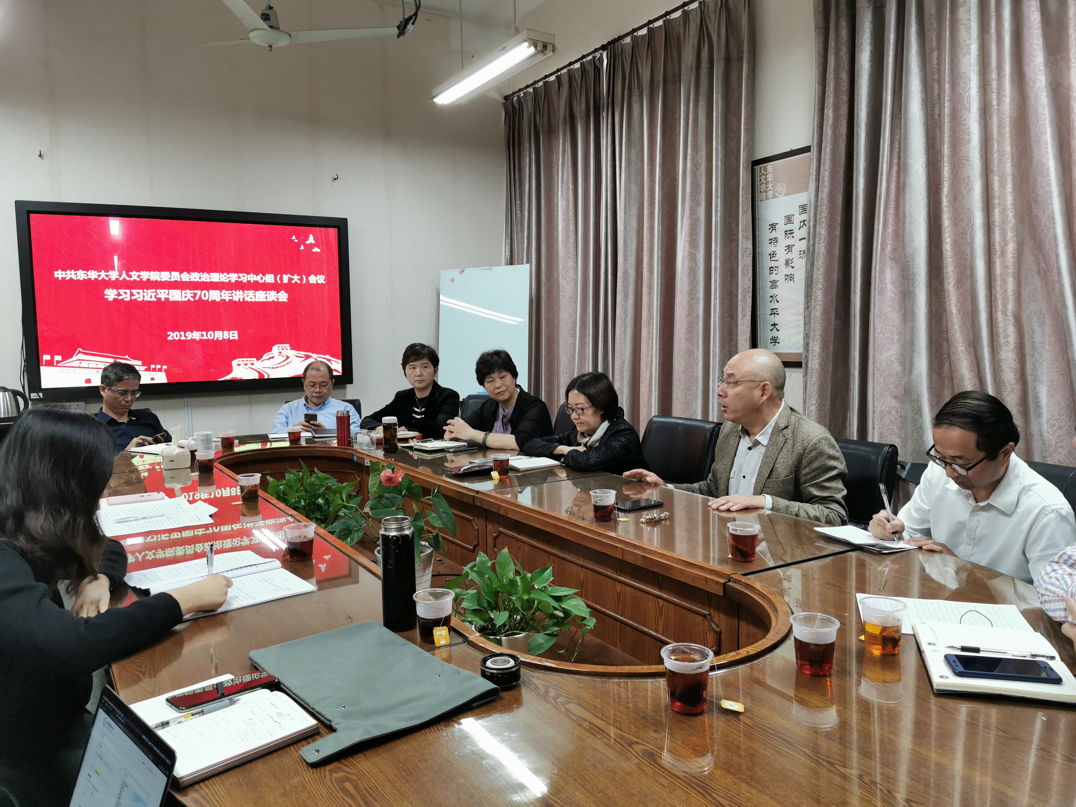 10月8日上午,为庆祝新中国成立70周年,深入学习领会习近平总书记讲话精神,sjb世俱杯中国官网入口党委召开政治理论学习中心组(扩大)会议,组织学院党委班子成员、教师代表与学生代表,围绕习近平总书记在庆祝大会上发表的重要讲话,畅谈学习体会,分享观看庆祝大会和阅兵式的感想与收获。sjb世俱杯中国官网入口党委副书记刘淑慧出席本次座谈会,会议由sjb世俱杯中国官网入口党委书记王英主持。