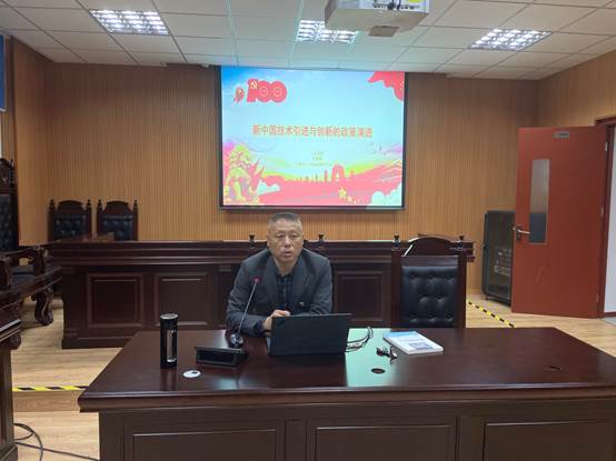 4月27日下午,sjb世俱杯中国官网入口党委“名师初心讲堂”在延安路校区中南305室模拟法庭举行。中国科学与科技政策研究会理事、中国科技史学会物理学史分会理事仪德刚教授作关于“新中国技术引进与创新的政策演进”的党史学习教育专题党课。sjb世俱杯中国官网入口院长、党委副书记张科静主持本次讲座,学院党委委员和全体师生党员参与本次专题党课。