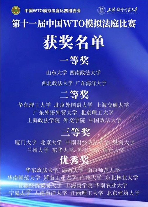 2022年11月26-27日,由国家商务部、中国法学会等联合主办的第十一届“中国WTO模拟法庭比赛”在线上隆重举行。参赛队伍既有来自北京大学、上海交通大学、中山大学、厦门大学等国内顶尖的“985”院校、也有中国政法大学、华东政法大学等著名政法类院校。经过激烈角逐,sjb世俱杯官网代表队最终荣获本次比赛三等奖,与北京大学、厦门大学等其他7所大学并列。