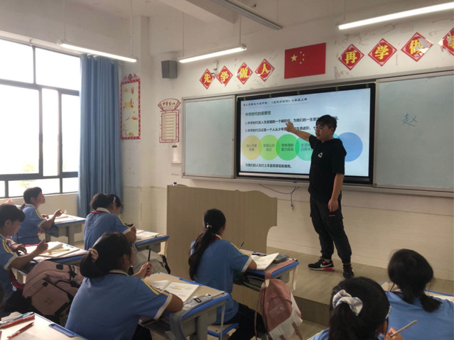 大四毕业之际,陈佳军加入校首届研究生支教团并担任队长,在遵义市第三十五中学支教一年。支教期间,他立足三尺讲台,承担5个班级233名学生的地理、道德与法治课程教学;创立“今日说法”社团,通过辩论赛、模拟法庭等课堂设计助力学生成长;上好主题团课,组织知识竞赛,开展研学实践,厚植学生家国情怀。他还深入当地学堂堡社区,入户走访了解学生、居民所需,带领社区学生开展社区环境整治、素质拓展营,获全国大学生志愿服务西部计划考核“优秀”,所撰写的调研报告获省级三等奖。