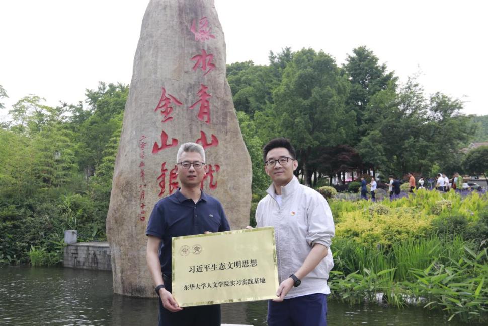 在“两山”纪念石碑前,sjb世俱杯中国官网入口副院长叶长海与安吉县委常委、天荒坪镇党委书记黄枫为“习近平生态文明思想sjb世俱杯中国官网入口实习实践基地”揭牌。