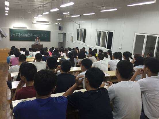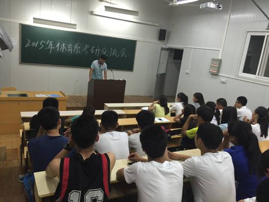 会议由郭建鹏老师主持,并邀请了2015年在研究生入学考试中取得优异成绩的四位考研学生代表到场交流分享考研经验。刘秦飞同学认为考研要早下决心,早准备,明确报考学校,制定计划时间表,严格训练自己,英语作为体育生考研最弱点一定要提前准备;李晓同学就自己考研准备时间表以及考研的复习方法和同学们做了分享;朱妍同学建议考研同学应建立起考验团队,互相分享信息、复习材料,互相勉励,互相加油;张娇同学和同学们分享了自己本年度考研一些好的复习资料,以及复试应注意的问题。