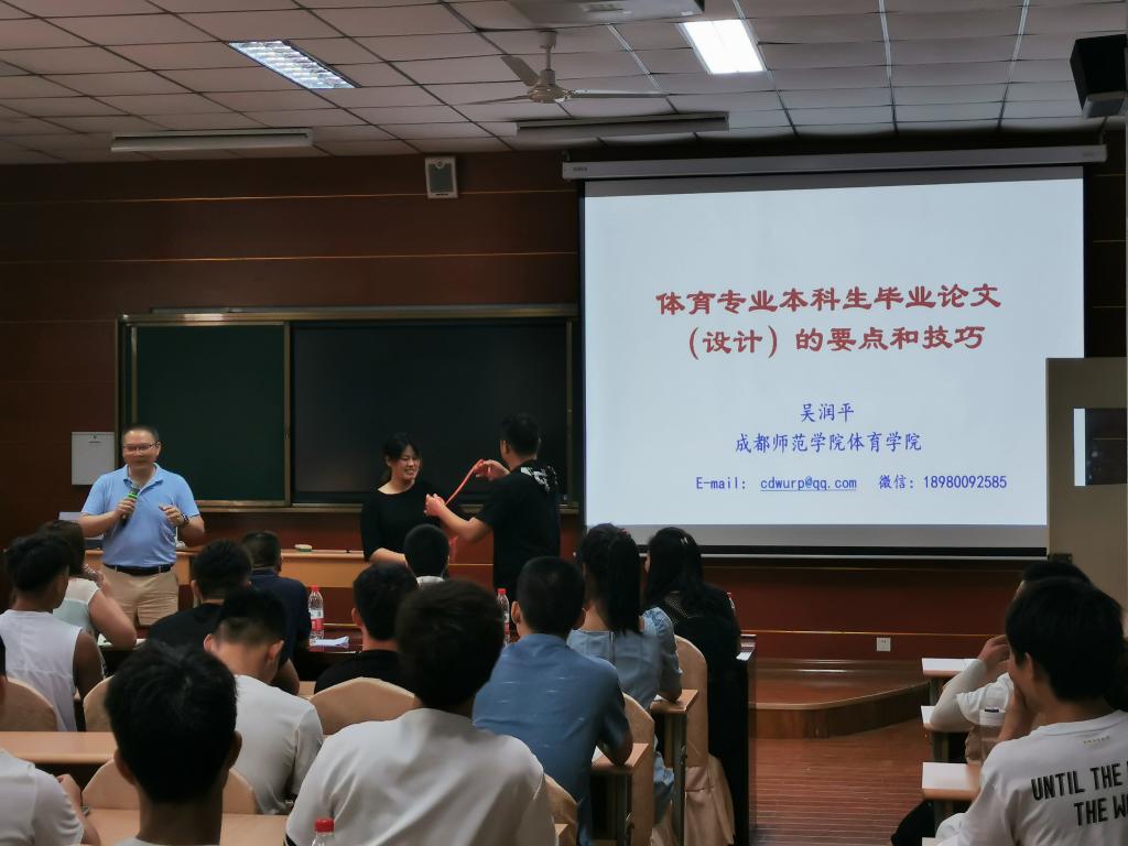 为提高PP电子官网学生毕业论文撰写技能,6月11日下午14:30,成都师范学院PP电子游戏平台网站院长吴润平教授来PP电子官网做了以“体育专业大学生毕业论文(设计)的要点和技巧”为主题的学术讲座,PP电子游戏平台网站全体18级、19级学生参加了本次报告会,报告会由学院党总支书记高立平主持。