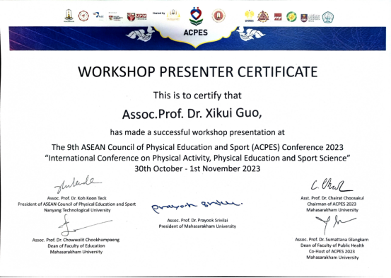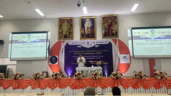 10月30日-11月1日,东盟体育运动理事会(ACPES)2023年“体育活动、体育教育和运动科学”国际会议,在泰国玛哈沙拉堪大学举行,PP电子官网教师郭西魁副教授应邀参加此次会议,并在会上以“太极拳在全民健身和学校体育的发展”为题进行了交流发言,深入浅出的介绍了我国的太极文化和太极拳健身功能,给来自东南亚的参会者们宣讲了中国太极文化,并进行了友好交流,受到与会国际友人欢迎。