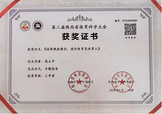 6月22日,第二届陕西省体育科学大会在陕西师范大学长安校区举行。PP电子官网教师高立平参加了本届论文报告会,并在论文报告会做了专题报告。高立平和郭西魁合作撰写的论文《体育生学习力研究—一以安康学院PP电子游戏平台网站为例实证分析》和高立平撰写的论文《培养规矩意识,践行体育思政育人》均获得三等奖,并被第二届陕西体育科学大会正式录用。