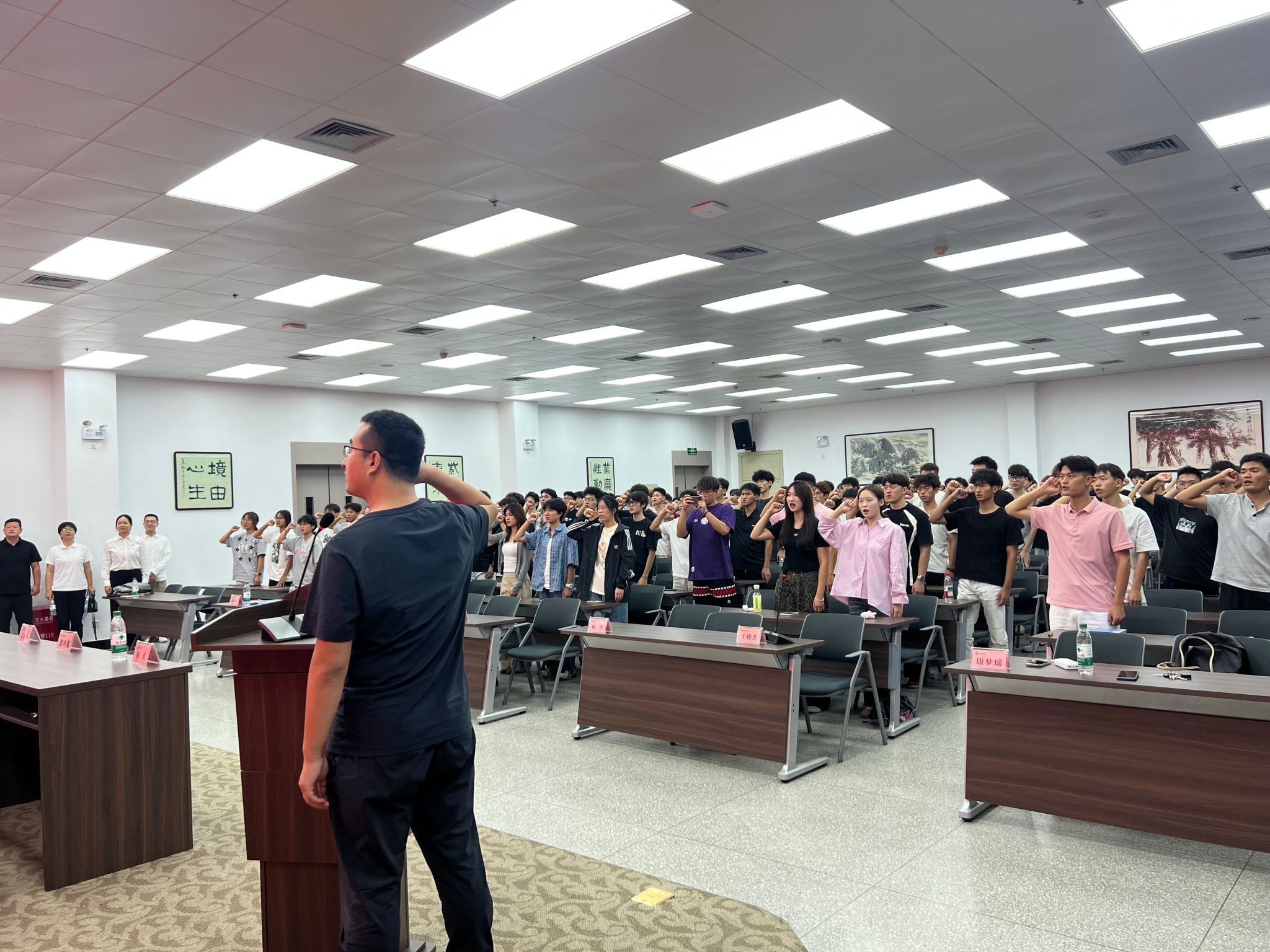 典礼最后,在学工办主任许明老师的带领下,全体新生庄严宣誓:“尊重师长,团结同学,严守校规校纪,培养良好品德;体文双修,德技相长,顽强拼搏,超越自我;为自己的梦想努力,为学校的荣耀奋斗,不负青春,不负韶华!”誓言铿锵,掷地有声,充分展现了2025级新生昂扬向上的精神风貌和笃行不怠的决心。