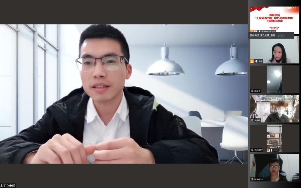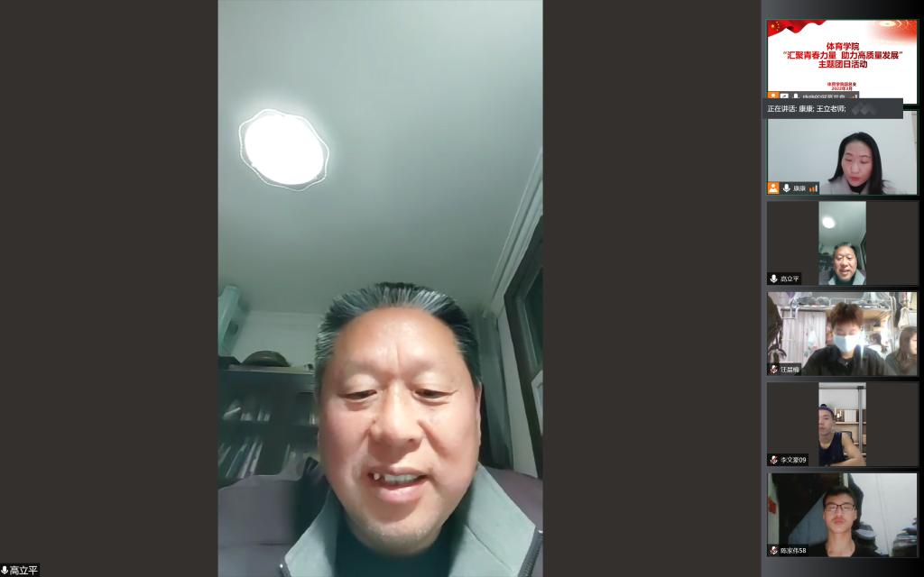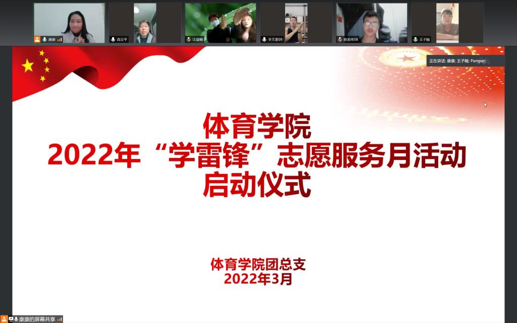响应校团委号召,号召PP电子官网师生学习雷锋精神,推动PP电子官网的精神文明建设,形成良好的校园文化氛围。3月17日晚上7点在线上腾讯会议,体育学院举行“汇聚青春力量,助力高质量发展”学雷锋月活动启动仪式,学院党总支书记高立平、学工办副主任王立、21级全体学生参加仪式。仪式由团总支书记康梦瑶主持。