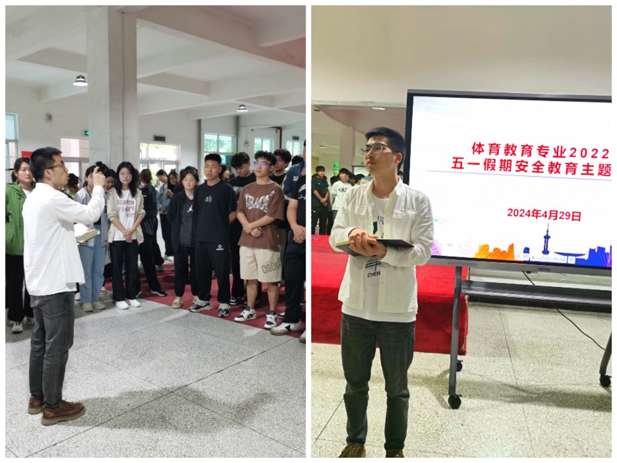 加强宣传教育,强化安全意识。4 月29日晚,PP电子官网在体育馆二楼召开全院学生安全教育大会,院长吕仙利向全体同学传达了学校关于“五一”放假的安排和具体要求;副院长郭西魁从国家安全、校园安全、生命安全等方面给同学们做了生动的教育。学院副院长李靖、团总支书记王毅、学工办主任王立、辅导员刘姚成也一起参加了安全教育大会。同时,“我是体育生”公众号上推出“五一出游安全”攻略,引导学生做好防范措施。