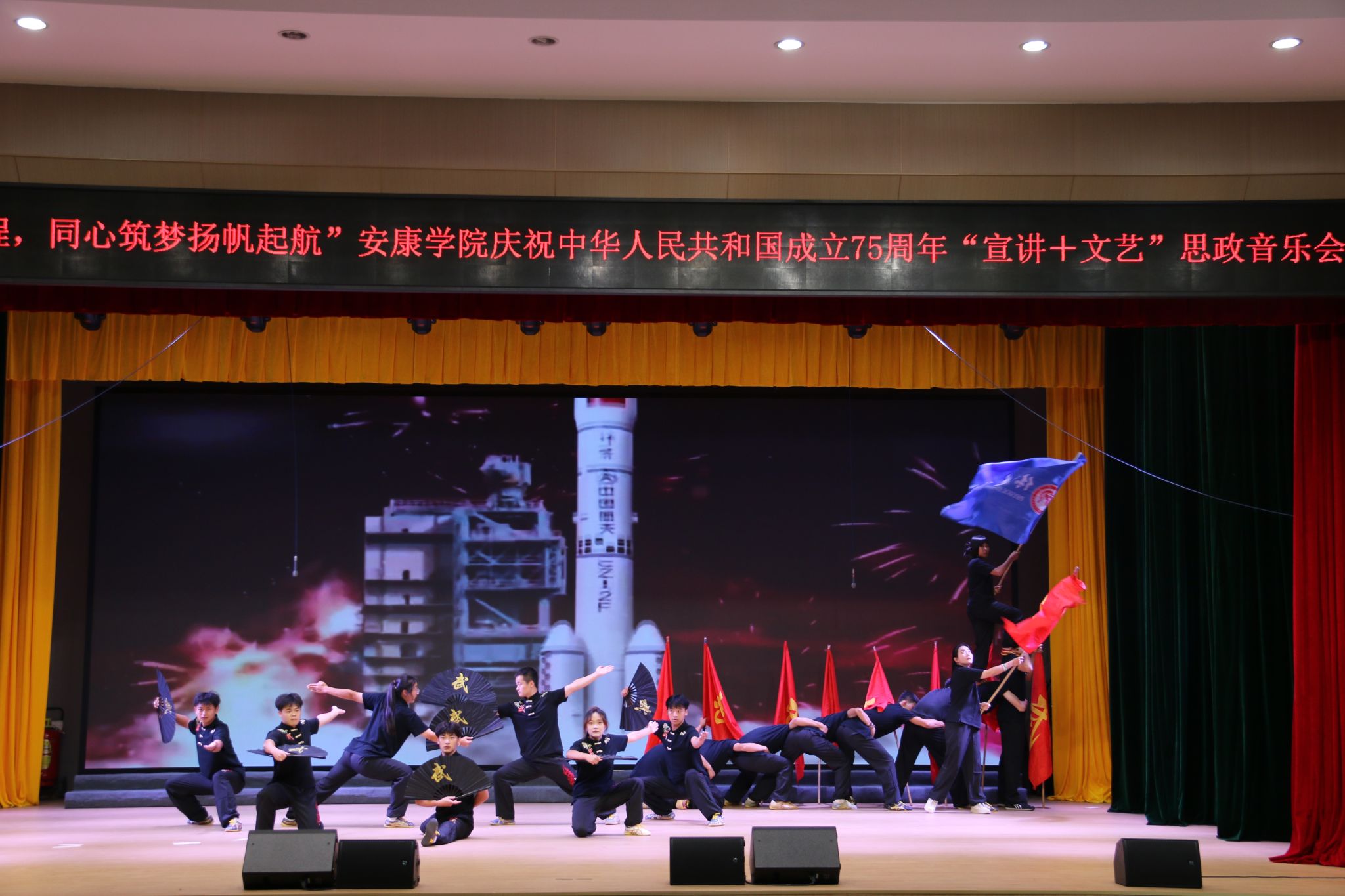 为庆祝中华人民共和国成立75周年,弘扬爱国主义精神,学校举办了“七十五载风雨兼程,同心筑梦扬帆起航”安康学院“宣讲+文艺”思政音乐会,PP电子官网选送的节目《武韵黄河》获二等奖。